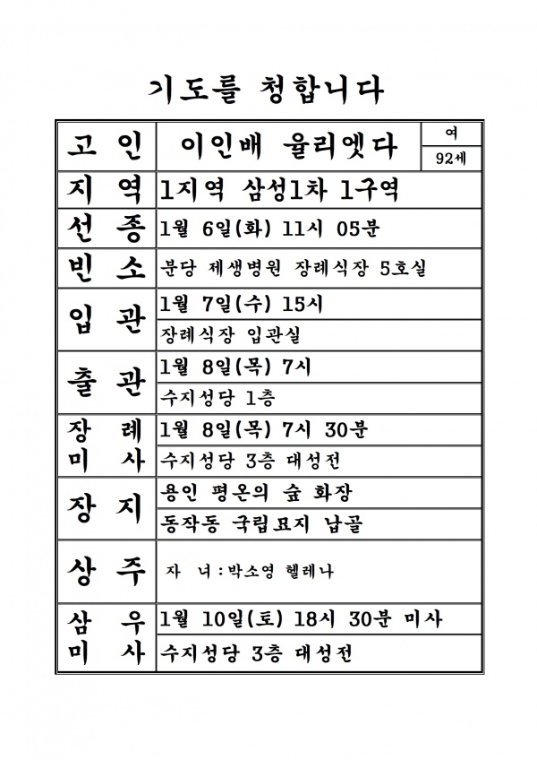 연도 연도공지(이인배 율리엣다) 페이지 정보 작성자 사무실 댓글 0건 조회 114회 작성일 26-01-06 17:32 목록 본문 기도를 청합니다. 이전글연도공지(양혜영 아가다) 26.01.07 다음글연도공지 (김정숙 매임데레사) 26.01.06 댓글 0 댓글목록 등록된 댓글이 없습니다.