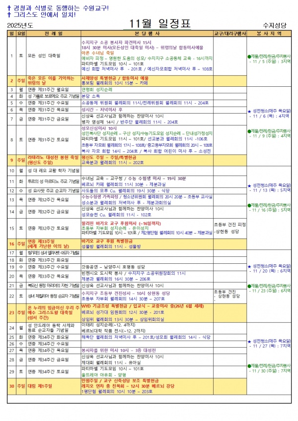 일정표 11월 일정표 페이지 정보 작성자 사무실 댓글 0건 조회 640회 작성일 25-11-01 11:46 목록 본문 일정표 이전글연도공지(이방자 소피아) 25.11.13 다음글연도공지(남궁현 도밍고) 25.10.28 댓글 0 댓글목록 등록된 댓글이 없습니다.