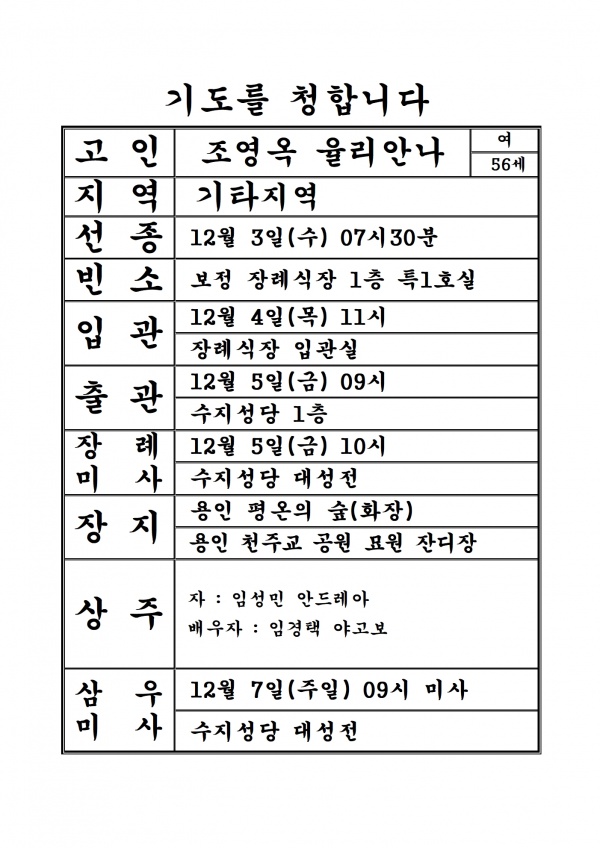 연도 연도공지(조영옥 율리안나) 페이지 정보 작성자 사무실 댓글 0건 조회 382회 작성일 25-12-03 08:42 목록 본문 기도를 청합니다. 이전글12월 일정표 25.12.07 다음글연도공지(김복진 요안나) 25.11.22 댓글 0 댓글목록 등록된 댓글이 없습니다.