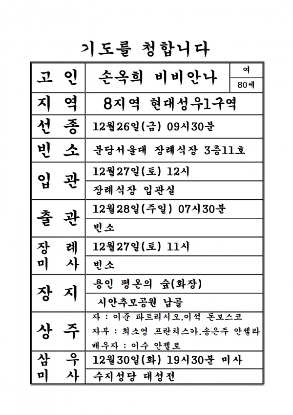 연도 연도공지(손옥희 비비안나) 페이지 정보 작성자 사무실 댓글 0건 조회 115회 작성일 25-12-26 17:54 목록 본문 기도를 청합니다 이전글연도공지(신현모 토마스아퀴나스) 25.12.27 다음글연도공지(조옥련 라자로) 25.12.23 댓글 0 댓글목록 등록된 댓글이 없습니다.