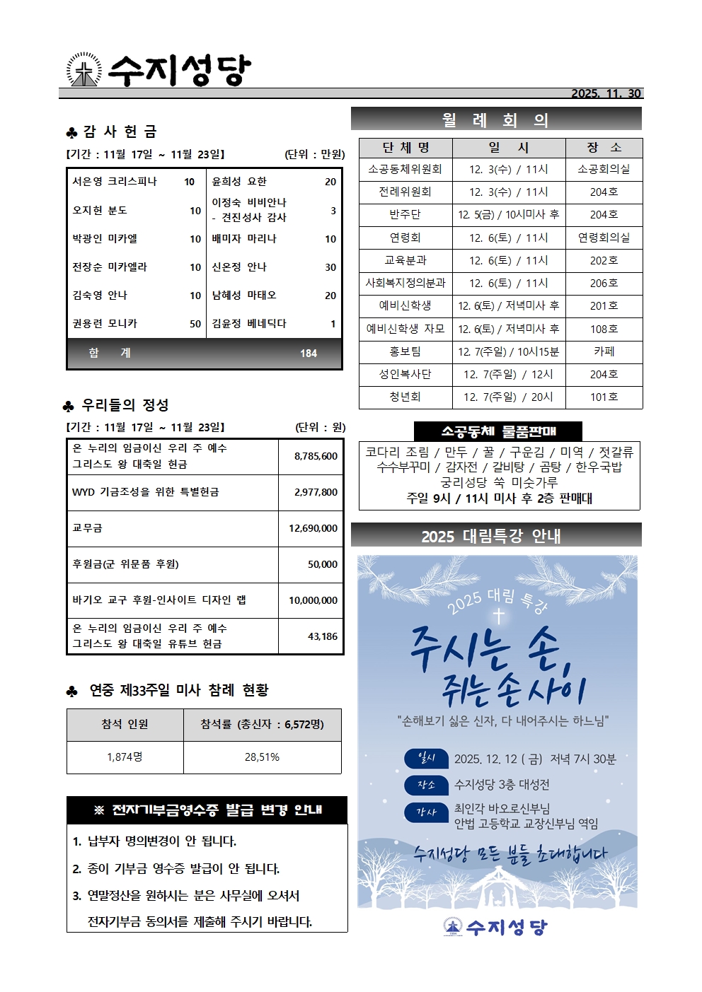 2025. 11. 30 - 대림 제1주일 페이지 정보 작성자 사무실 댓글 0건 조회 34회 작성일 25-11-28 09:17 목록 본문 수원교구 주보는 아래 링크를 클릭하십시오. 관련링크 https://www.casuwon.or.kr/journal/jubo/ebook/2347 1회 연결 https://www.casuwon.or.kr/uploads/cas02/ext_church_journal/2180/book/B… 1회 연결 다음글2025. 11. 23 - 온 누리의 임금이신 우리 주 예수 그리스도왕 대축일 25.11.21 댓글 0 댓글목록 등록된 댓글이 없습니다.