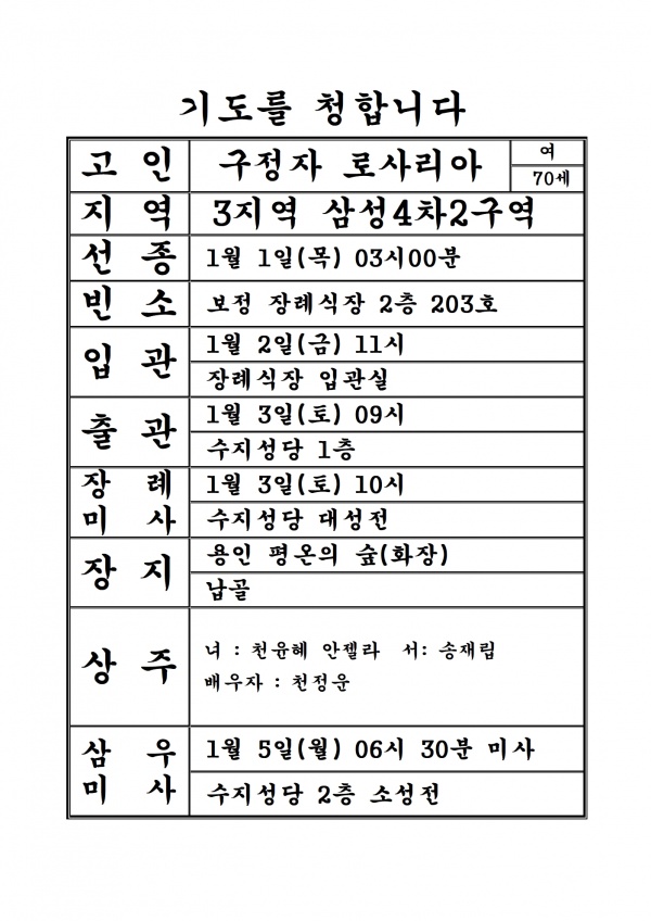 연도 연도공지(구정자 로사리아) 페이지 정보 작성자 사무실 댓글 0건 조회 236회 작성일 26-01-01 08:08 목록 본문 기도를 청합니다. 이전글봉사자 추천서 26.01.04 다음글연도공지(신현모 토마스아퀴나스) 25.12.27 댓글 0 댓글목록 등록된 댓글이 없습니다.