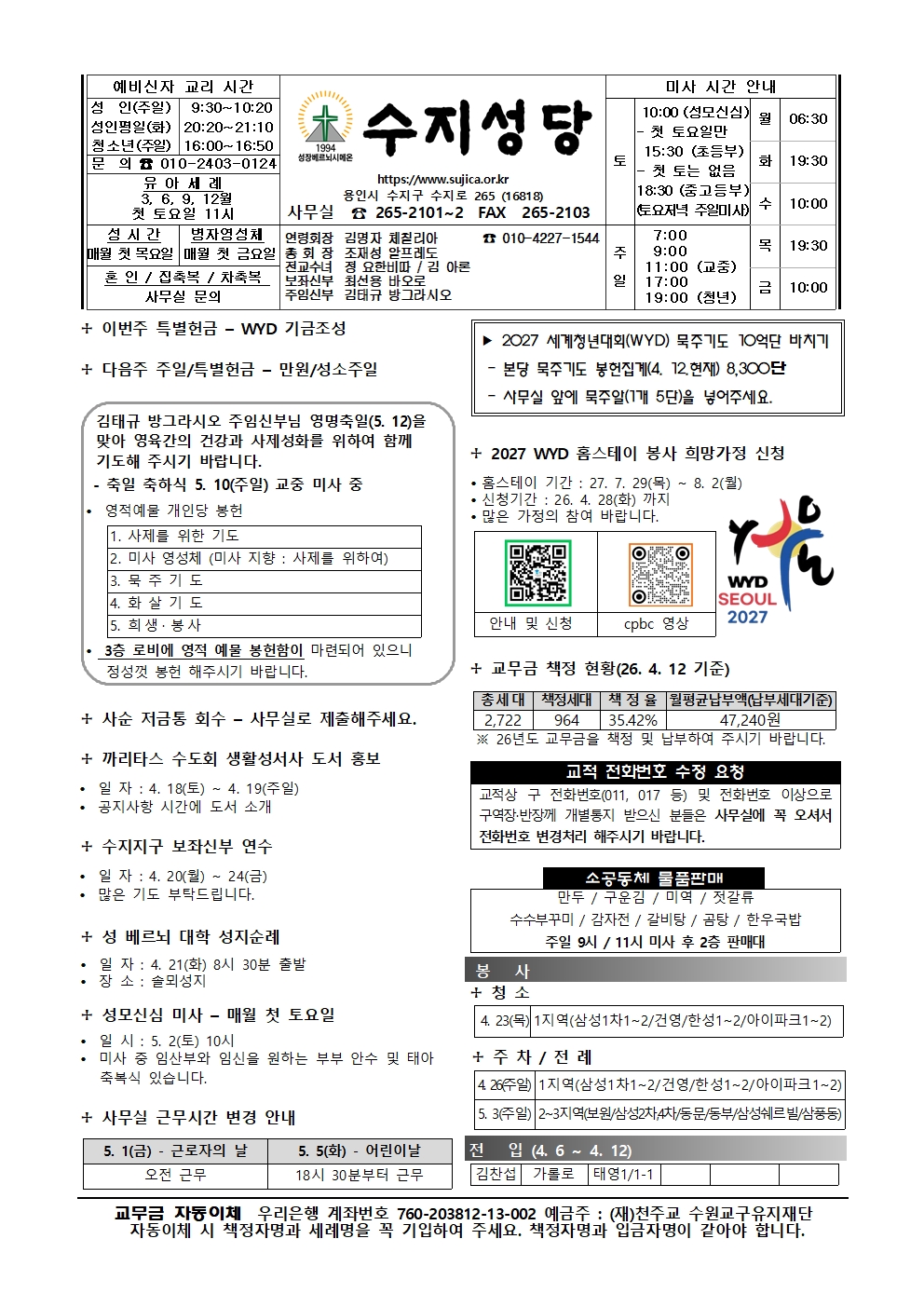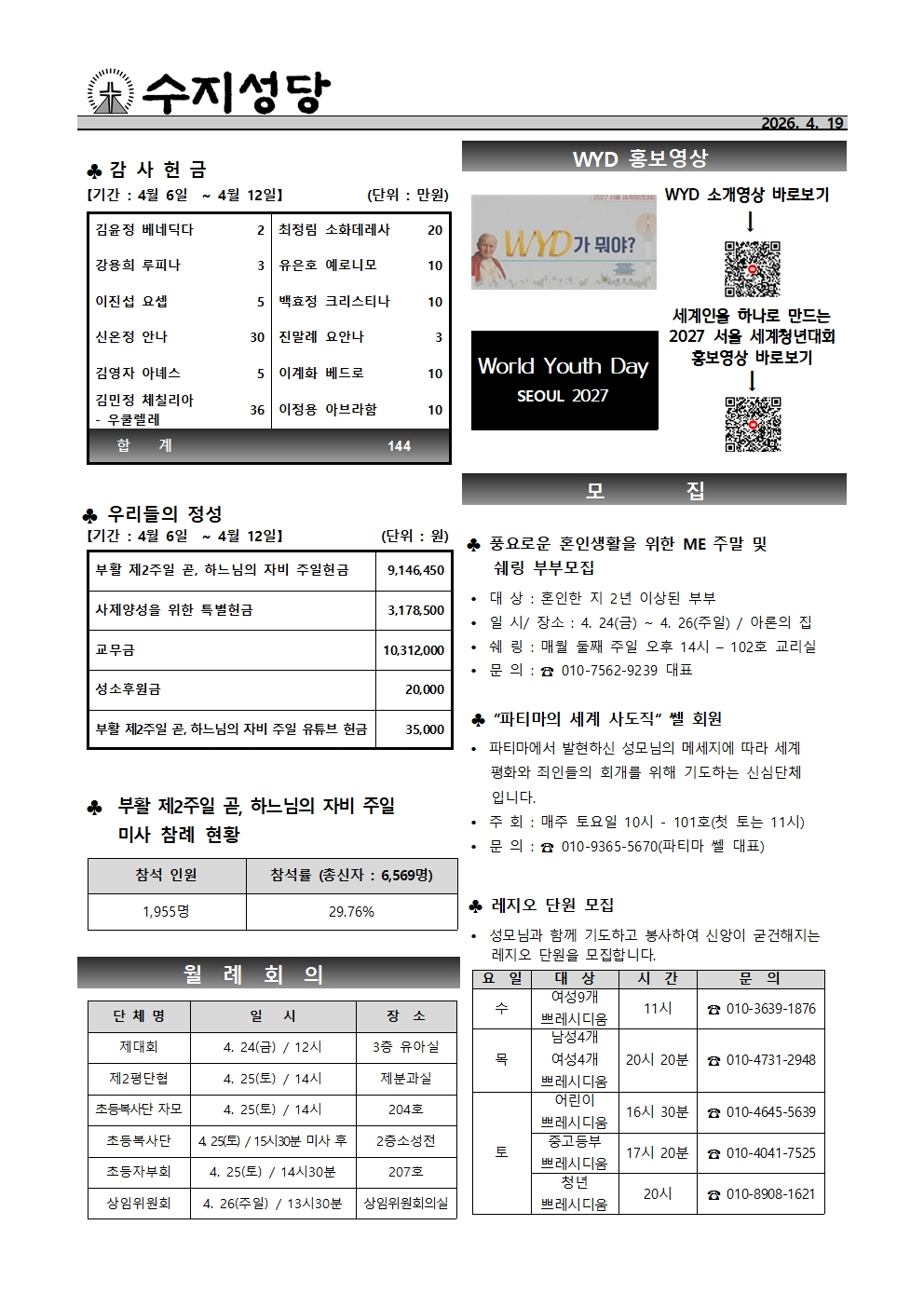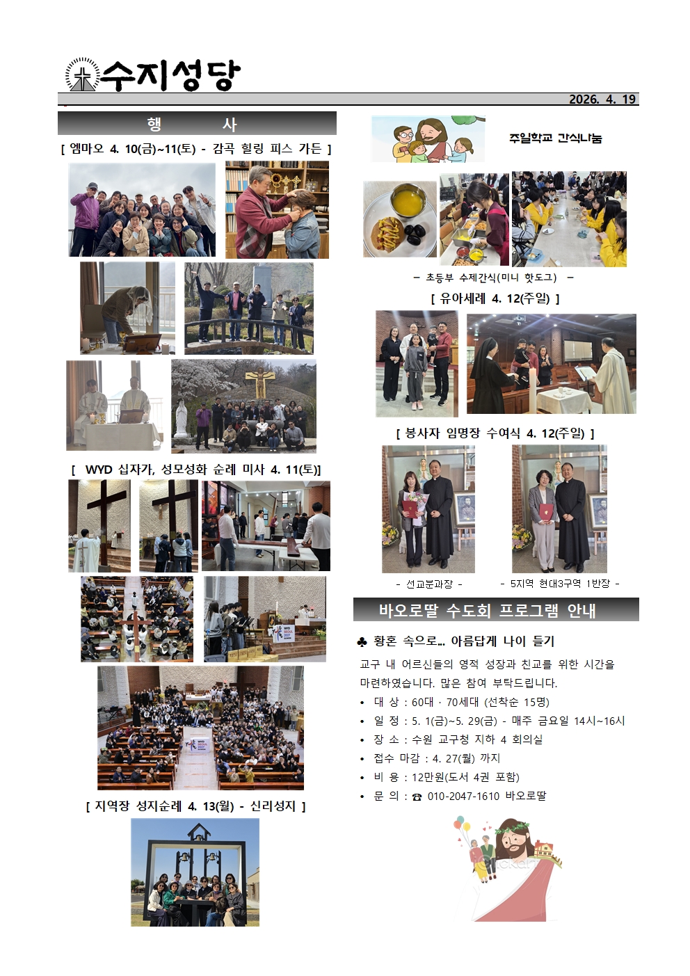 2026. 4. 19 - 부활 제3주일 페이지 정보 작성자 사무실 댓글 0건 조회 231회 작성일 26-04-17 09:35 목록 본문 수원교구 주보는 아래 링크를 클릭하십시오. 관련링크 https://www.casuwon.or.kr/journal/jubo/ebook/2369 22회 연결 다음글2026. 4. 12 - 부활 제2주일 곧, 하느님의 자비 주일 26.04.10 댓글 0 댓글목록 등록된 댓글이 없습니다.