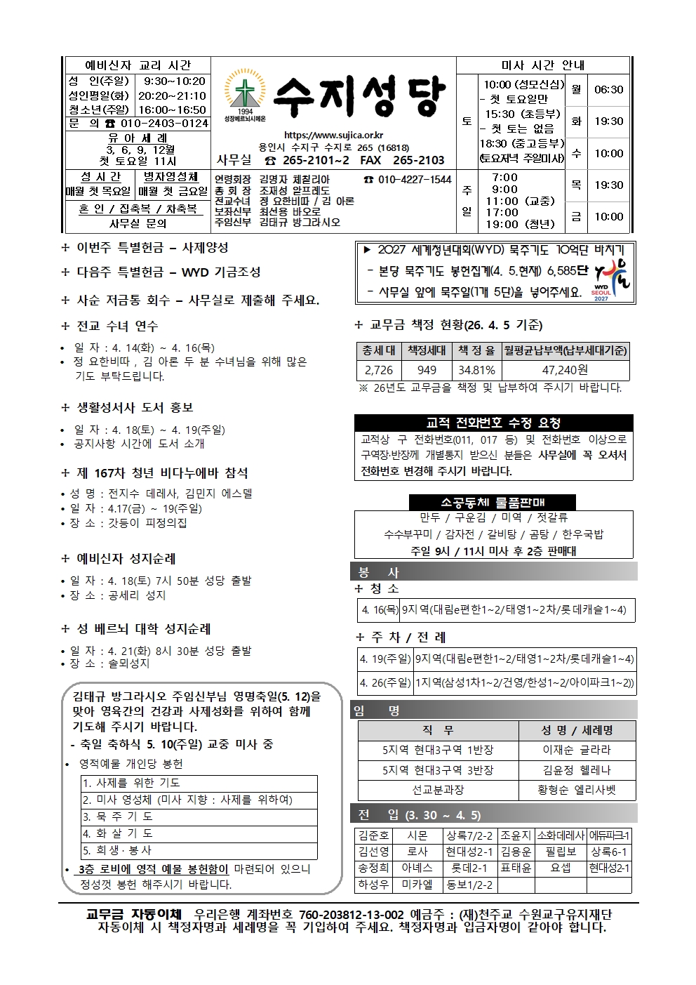 2026. 4. 12 - 부활 제2주일 곧, 하느님의 자비 주일 페이지 정보 작성자 사무실 댓글 0건 조회 193회 작성일 26-04-10 09:36 목록 본문 수원교구 주보는 아래 링크를 클릭하십시오. 관련링크 https://www.casuwon.or.kr/journal/jubo/ebook/2368 4회 연결 https://www.casuwon.or.kr/uploads/cas02/ext_church_journal/2199/book/B… 3회 연결 다음글2026. 4. 5 - 주님 부활 대축일 26.04.03 댓글 0 댓글목록 등록된 댓글이 없습니다.