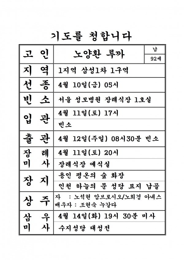 연도 연도공지(노양환 루까) 페이지 정보 작성자 관리자 댓글 0건 조회 57회 작성일 26-04-10 14:00 목록 본문 기도를 청합니다. 이전글연도공지(공명식 아오스딩) 26.04.11 다음글2026년 4월 성가표 26.04.07 댓글 0 댓글목록 등록된 댓글이 없습니다.